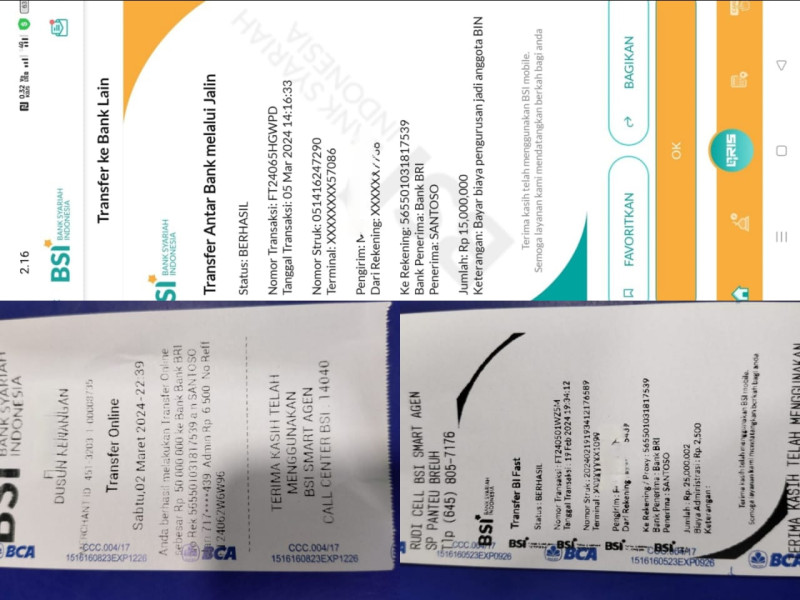 Nomor rekening yang digunakan oleh pelaku dalam aksi penipuan ini adalah 56550103xxxxxxx (BRI atas nama Santoso) dan 07555xxxxx (BNI atas nama Ahmad).