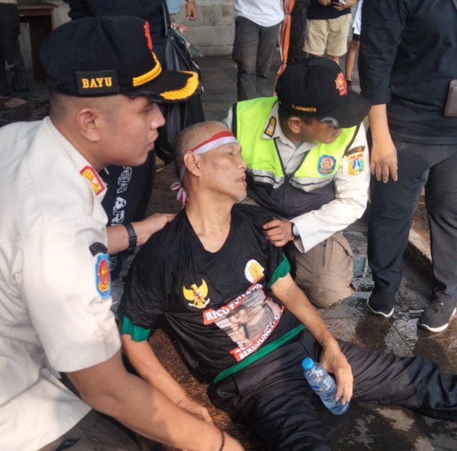 Petugas Satpol PP yang bertugas di sekitar lokasi segera meminta pria tersebut untuk keluar dari kolam. “Pak naik pak, naik pak,” teriak salah satu petugas. Namun, Alex tetap berenang ke arah tengah kolam sambil membawa spanduk berisi permintaan pembebasan seorang bernama Rico Pujianto.